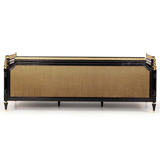 The Louis Three-Seater Sofa is a neoclassical masterpiece that combines premium materials and exquisite design to exude elegance and grandeur. Crafted with a Grade A Georgian beechwood frame, this sofa guarantees exceptional durability and strength. Its seat is filled with cold foam, ensuring unparalleled comfort even after prolonged use. The luxurious Turkish velvet and woven fabric in a deep black hue, accented with subtle golden stripes, paired with gold leaf detailing on the legs and embellishments, creates a regal and opulent appearance. The glossy black polyurethane finish, along with the parallel lines and gentle curves of the legs and armrests, transforms this sofa into a work of art. Compared to other neoclassical sofas, the Louis stands out with its meticulous CNC detailing, showcasing precision and sophistication that captivates every onlooker. If you’re seeking furniture that offers both comfort and aesthetic brilliance, the Louis Three-Seater Sofa is an unrivaled choice.